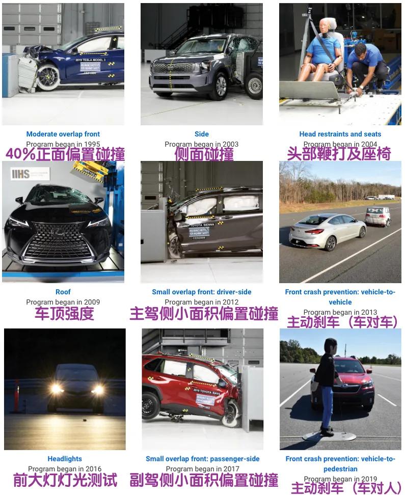 1995年,美国IIHS就不满足于“不现实”的100%正面碰撞,首度推出40%正面偏置碰撞;2003年引入侧面碰撞、2009年引入主动刹车(车对车)测试;2012年加入更“变态”的主驾侧25%小面积偏置碰撞测试,2017年该测试延伸至副驾侧;2016年新增前大灯灯光测试、2019年在原来的主动刹车测试基础上,增加车对行人的测试项目;……