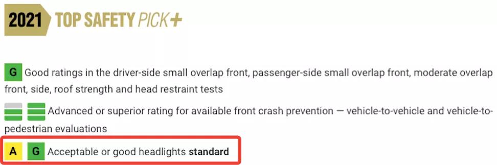 ▲TSP+作为IIHS的最高评级,其与TSP的区别在于,标配的头灯在灯光测试中也必须达到“Acceptable(可接受)”或以上,很多豪华品牌都不一定做得到。